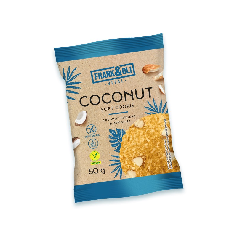 Miękkie ciasteczko kokosowe z migdałami. Bogate w błonnik, wegańskie ciastko kokosowe miąższ kokosowy & migdał to pożywna, pełnowartościowa przekąska, idealna do pracy, szkoły czy w podróży. Produkt bezglutenowy, bez dodatku cukru (zawiera cukry naturalnie występujące).