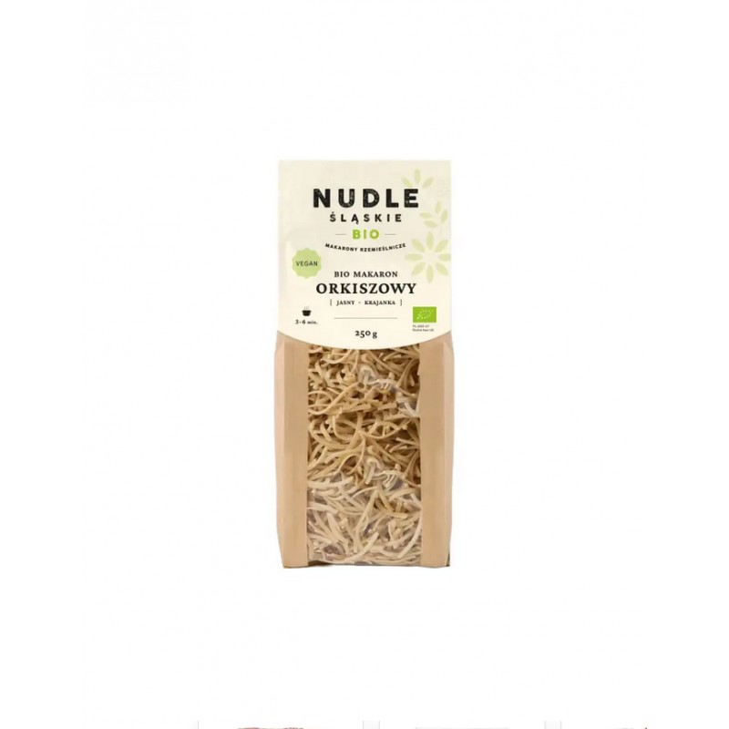 BIO makaron orkiszowy jasny krajanka wytworzony w 100% z mąki orkiszowej, wegański. Ekologiczny makaron orkiszowy jasny krajanka to produkt rzemieślniczy, ręcznie pakowany, suszony tradycyjną metodą na drewnianych sitach, wolno przez 16 godzin. Jest doskonałym źródłem białka oraz witamin. Odpowiedni dla wegan.