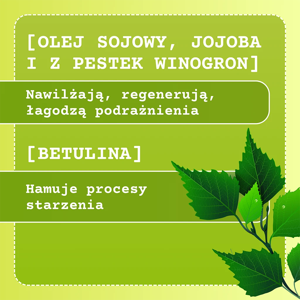 Woda, Glukozyd laurylowy, Gliceryna, Betaina kokamidopropylowa, Kwas mlekowy, Glukozyd kokosowy, Ekstrakt z liści borówki brusznicy, Panthenol, Skwalan, Alantoina, Oleinian glicerolu, Benzoesan sodu, Olejek lawendowy, Kompozycja zapachowa