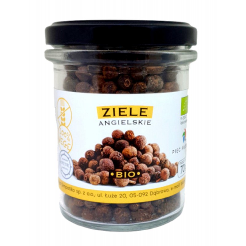 Ekologiczne ziele angielskie zapakowane w szklany słoiczek.