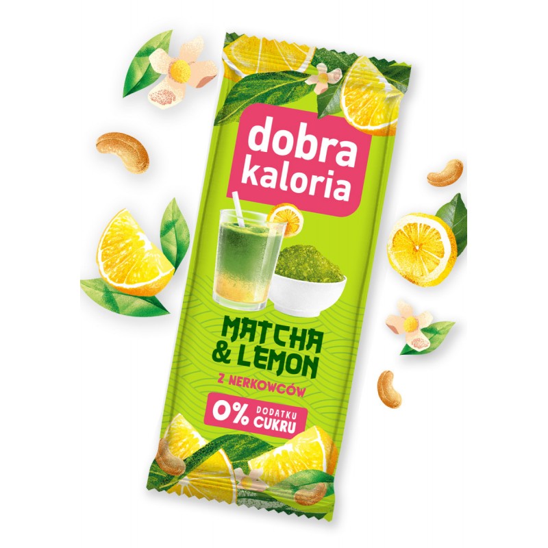 Baton z nerkowców Matcha & Cytryna bez cukru. Batonik owocowo-orzechowy o smaku cytrynowym z dodatkiem herbaty matcha. Sycąca, pożywna, bogata w błonnik przekąska bez dodatku cukru (zawiera cukry naturalnie występujące).