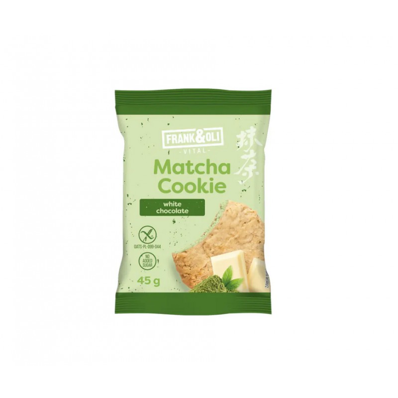 Miękkie ciasteczko owsiane Matcha z białą czekoladą bez dodatku cukru (zawiera cukry naturalnie występujące). Ciastko owsiane z nadzieniem z zielonej herbaty matcha i białej czekolady. Produkt bezglutenowy, bogaty w błonnik pokarmowy. Zawiera substancję słodzącą.