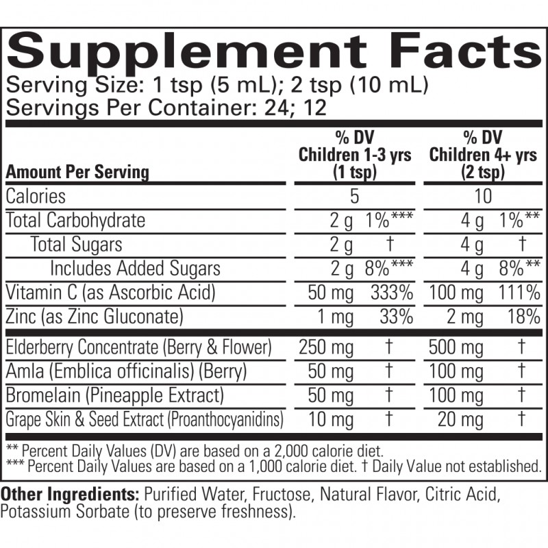 SKŁADNIKI: Koncentrat z czarnego bzu (jagody i kwiaty), Witamina C (kwas L-askorbinowy), Amla (Emblica officinalis) (jagody), Bromelaina, Ekstrakt ze skórek i pestek winogron (proantocyjanidyny), Cynk (glukonian cynku), Woda oczyszczona, kwas: kwas cytrynowy; fruktoza, substancja konserwująca: sorbinian potasu; ekstrakt z pestek grejpfruta, naturalne aromaty.